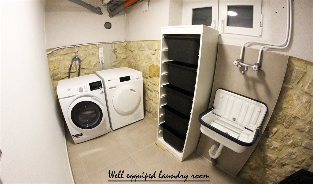 In the basement we have a large kitchen with access to a terrace, a nice garden and the laundry room with two brand new wash-dryer machines one iron and an iron table.