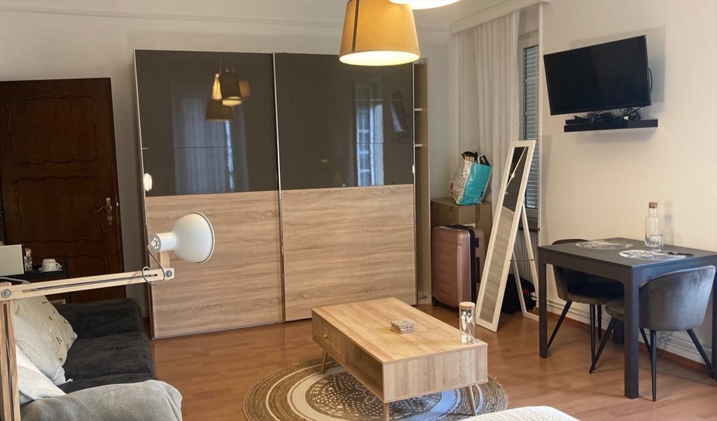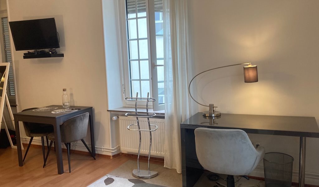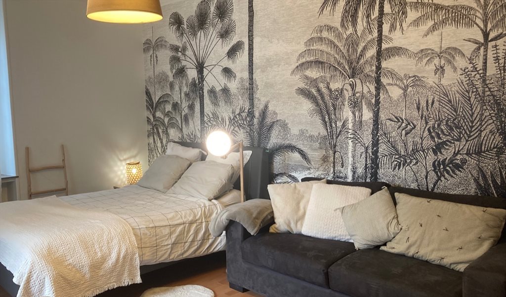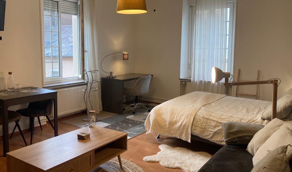 The room is furnished with a double bed (140cmx200cm), a sofa, a big wardrobe, a dining table and 2 chairs, a desk, a bedside table, TV and DVD player. Wifi + internet via cable available.