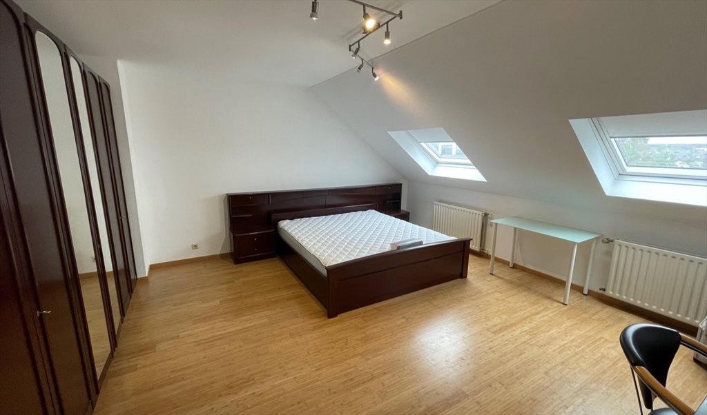 The bedroom is equipped with a double bed (duvets, mattress protector), a desk, a chair, a trash can and a wardrobe, two radiators and two windows.