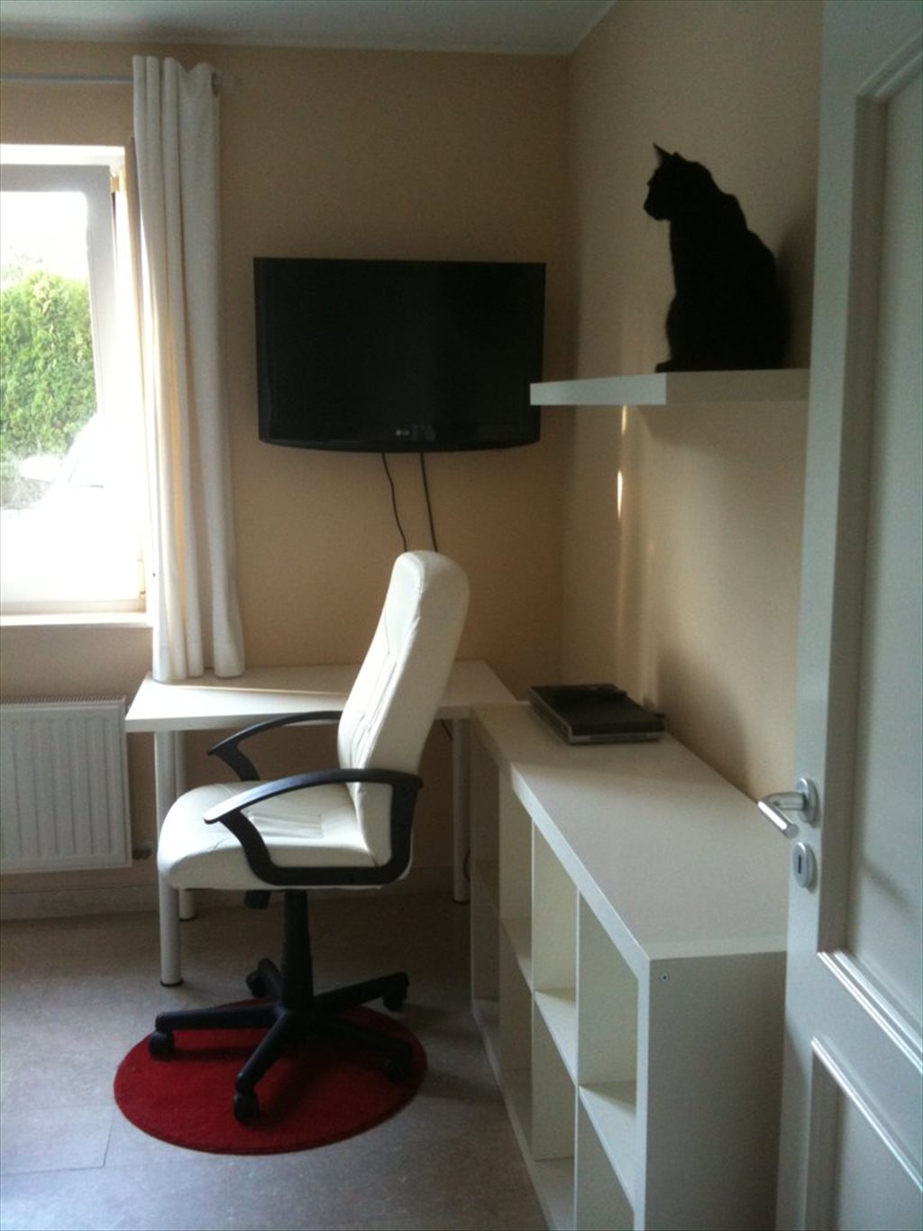 Partie privative : grand lit double (literie comprise), télévision avec une centaine de chaînes dans la chambre, wifi, bureau, chaise de bureau en cuir, armoire avec penderie et cintres compris, table de nuit avec lampe, étagère, rideaux et volets.