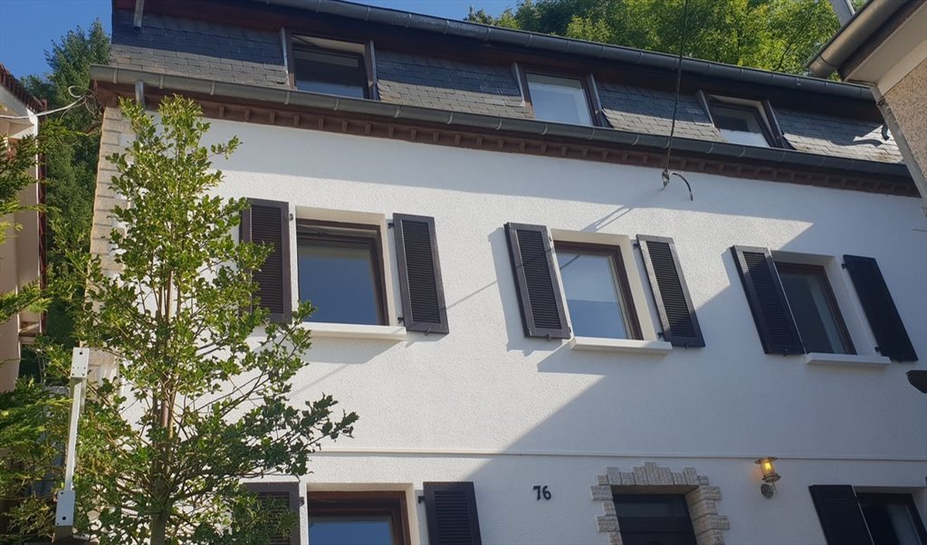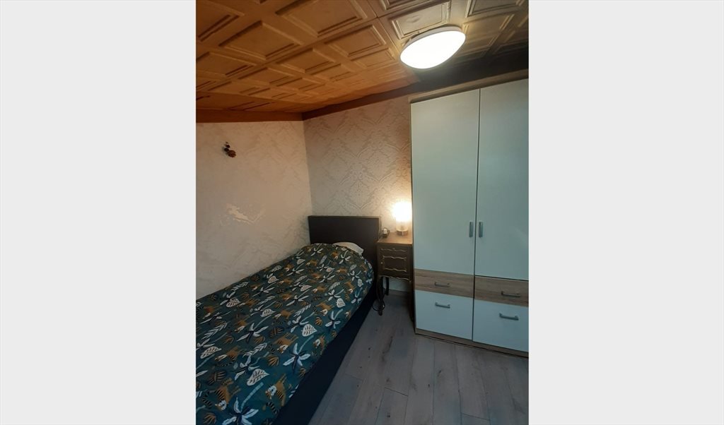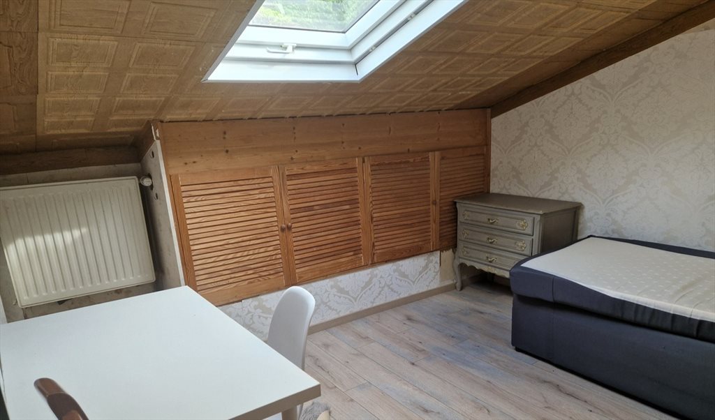Grande maison individuelle, idéalement située à proximité de Kirchberg. La chambre est meublée avec un lit, une table de chevet avec une lampe, une armoire, un miroir, un bureau et une chaise et une petite cuisine.